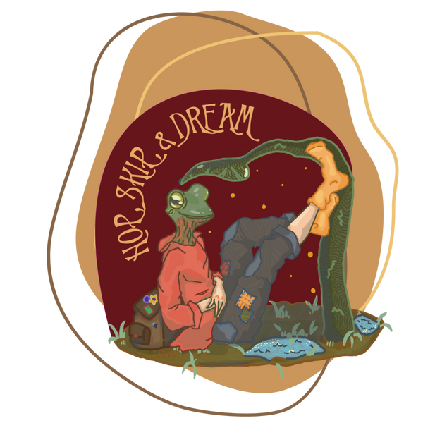 "Hop, Skip, Dream" is more than an illustration; it's a portal to a world where the line between dreams and reality is tenderly blurred. The dreamy smile on the character's frog face radiates contentment, inviting onlookers to share in a moment of musing relaxation. It's a celebration of the natural world, the fantastical, and the peaceful moments of reflection that journeying through life affords us.