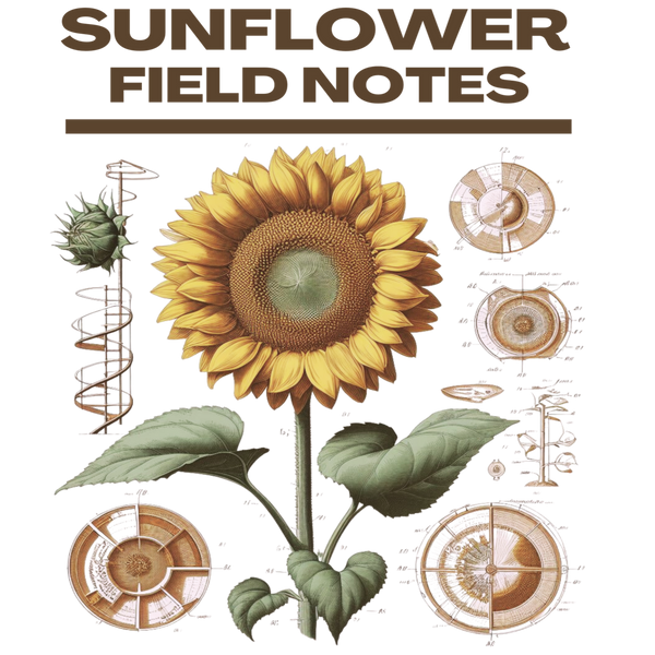 "SUNFLOWER FIELD NOTES," boldly inscribed above the illustration, reinforces the theme of scientific exploration and the inquisitive human spirit. This artwork does more than capture the aesthetic appeal of the sunflower; it serves as a bridge between the casual observer’s admiration and the scientist's deeper understanding, embodying the fusion of art and science.