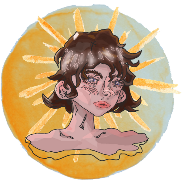 The illustration's circular composition mirrors the sun itself, encapsulating the subject in a universe of thought and light. This framing not only enhances the solar motif but also adds a dream-like quality to the scene, inviting viewers to ponder the boundless nature of self-reflection and the warmth of one's inner light.