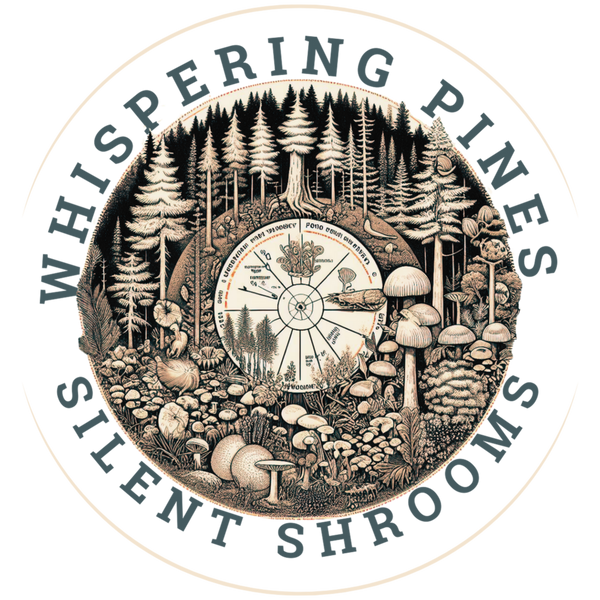 Encircling the artwork, the words "WHISPERING PINES" and "SILENT SHROOMS" curve along the circular frame’s path, their classic typography complementing the timeless nature of the scene. This choice of lettering enhances the image's peaceful, almost mystical quality, reminiscent of quiet strolls through the woods, where the soft crunch of pine needles underfoot and the gentle whispering of the trees are the only sounds.