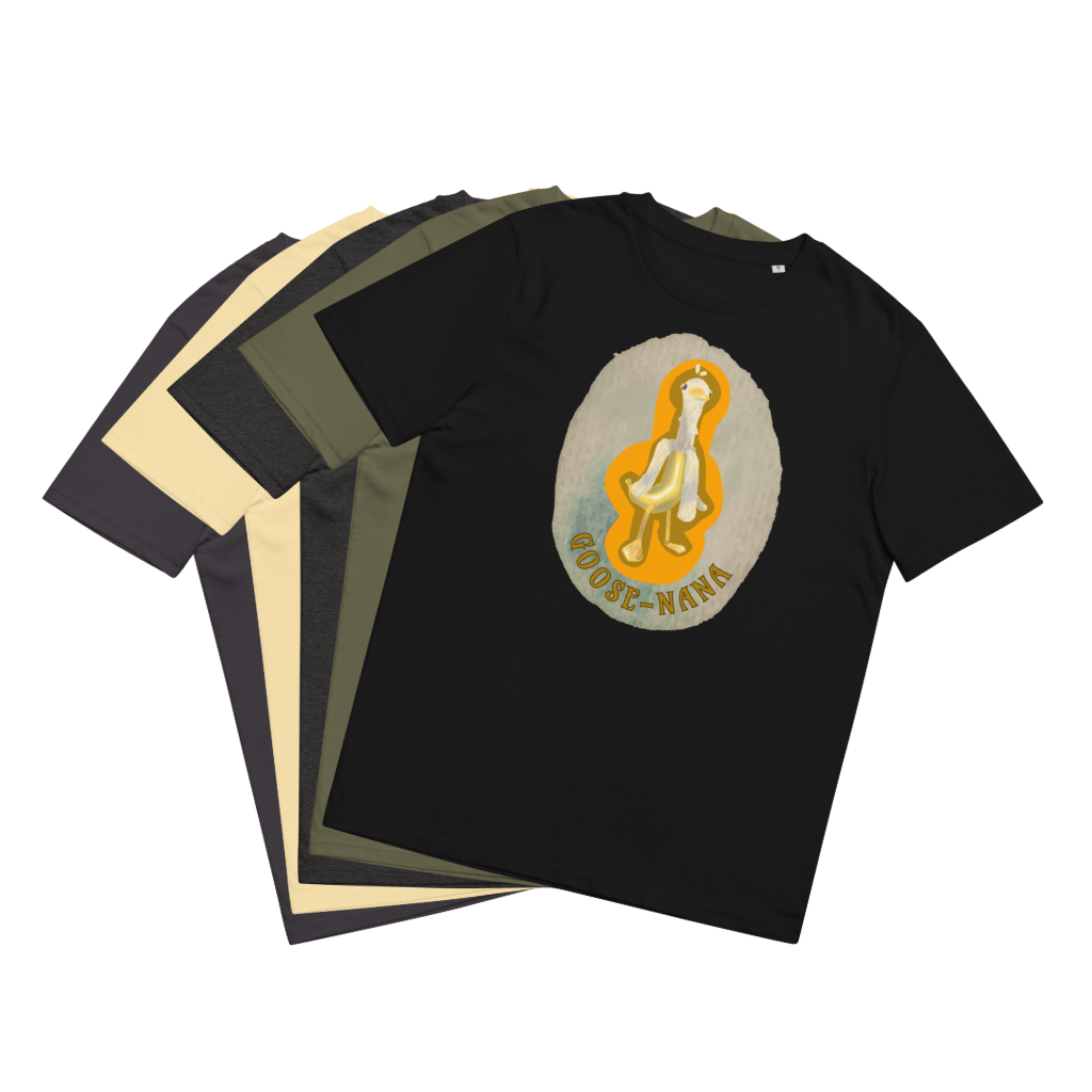 Order your Goose-nana T-Shirt today and infuse your wardrobe with humor and whimsy. Let it be a reminder to stay open to life's unexpected moments and find beauty in unconventional places. Wear it proudly as a symbol of your love for creativity while making a positive impact on the planet.