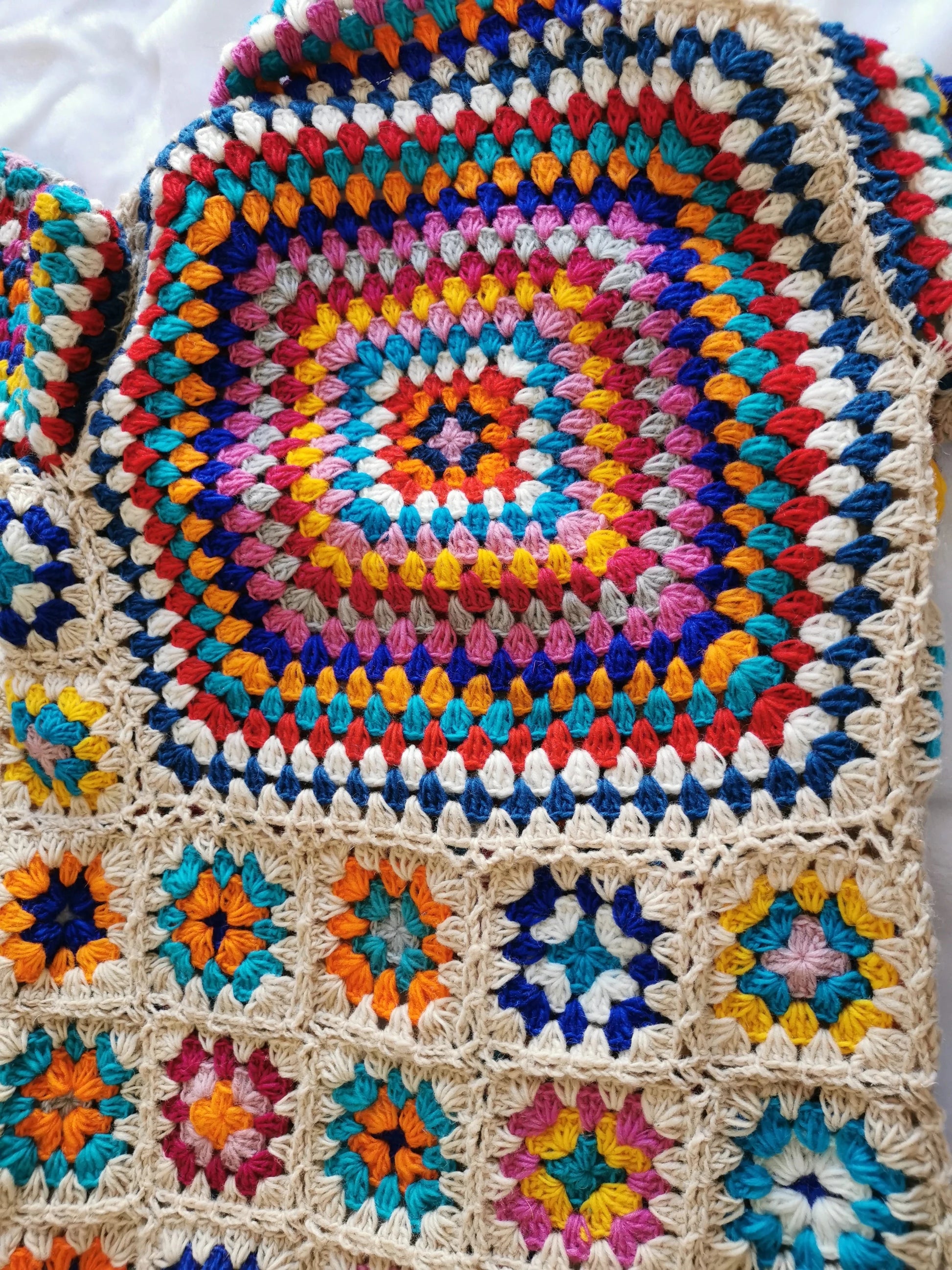 Indulge in the joy of colors with our festive, hand-crocheted sweater. Crafted in 100% wool, this coat-style garment exudes warmth and style—perfect for those who dare to don their vibrant spirit!
