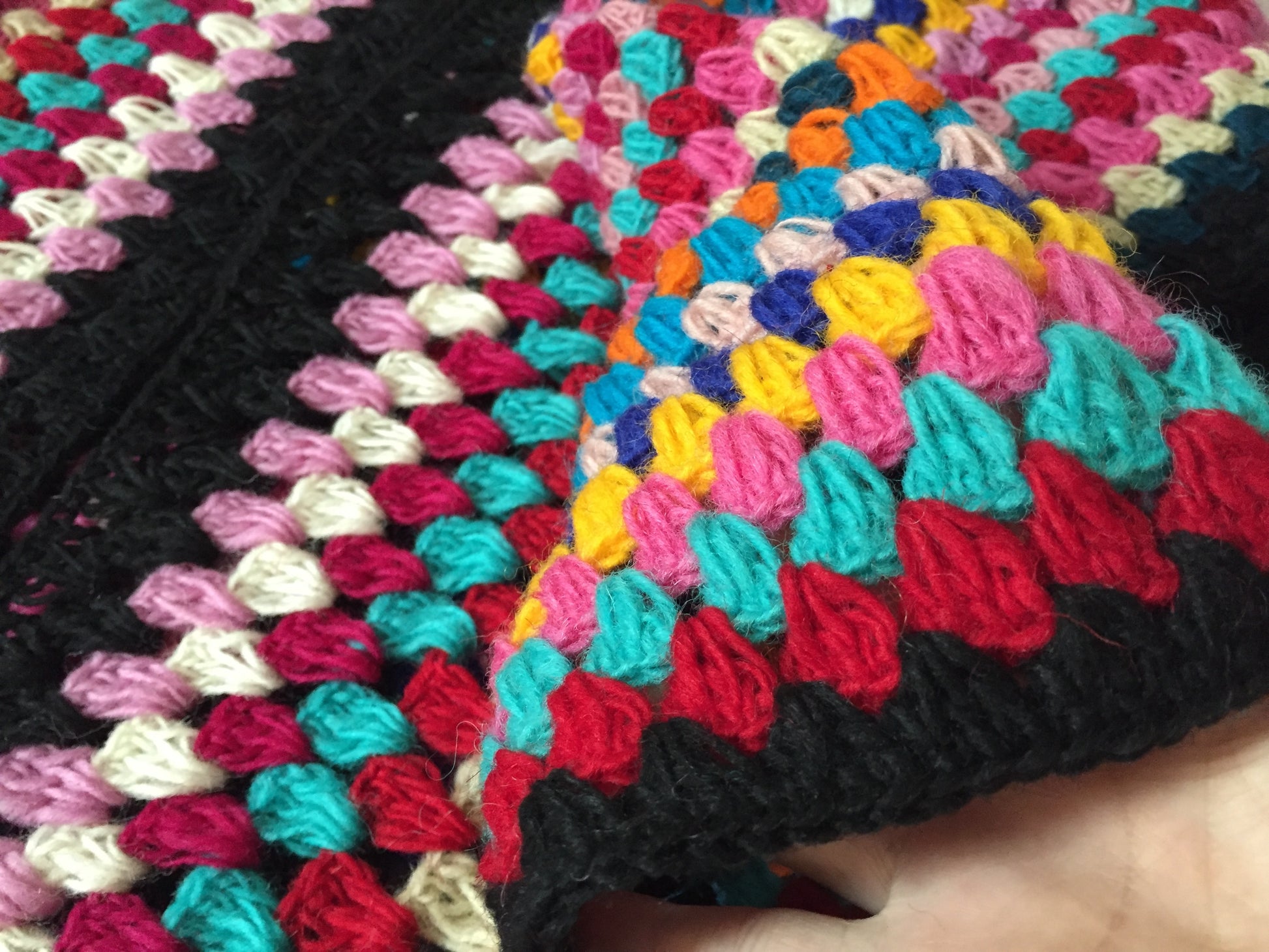 Choose between a beige or black background as the canvas for the multi-colored crochet design. Regardless of your pick, the explosion of colors promises to breathe life into any outfit.