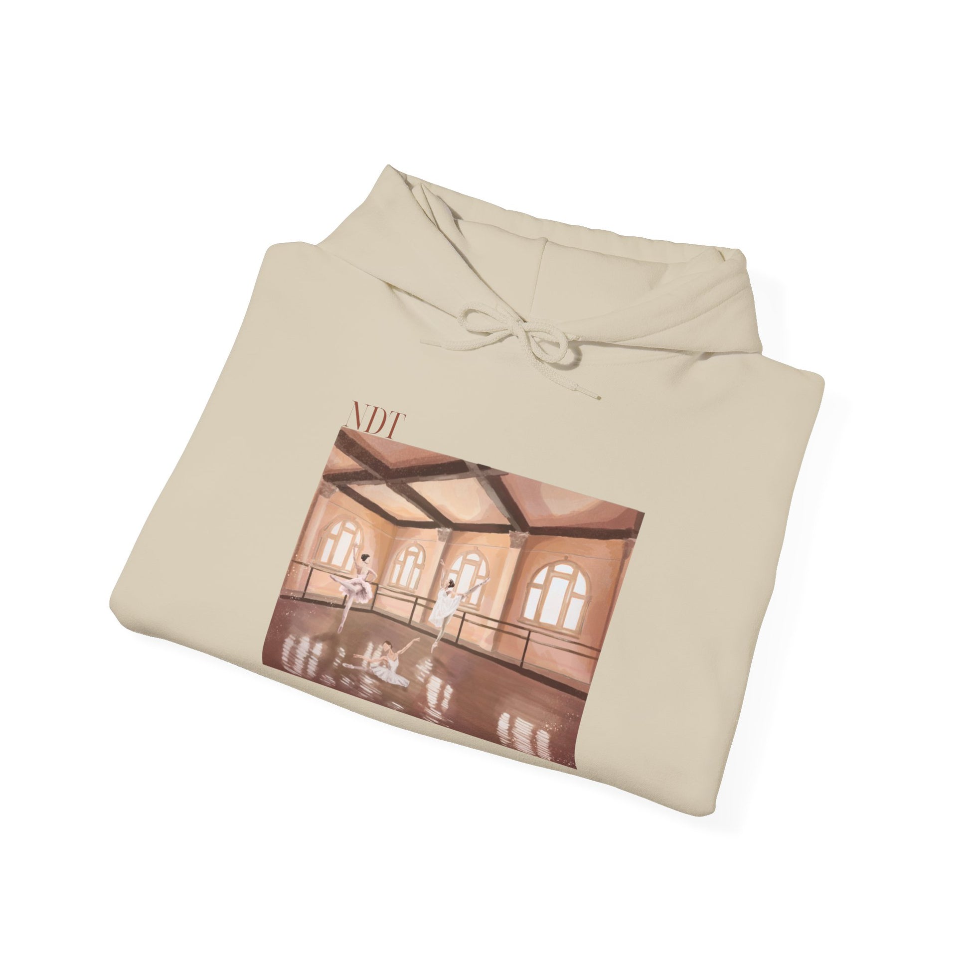This unisex heavy blend hooded sweatshirt shows off a beautiful original painting of Northern Dance Theatre's historic Studio 1 while feeling like relaxation itself. Made with a thick blend of cotton and polyester, it feels plush, soft and warm, a perfect choice for any cold day. In the front, the spacious kangaroo pocket adds daily practicality while the hood's drawstring is the same color as the base sweater for extra style points.